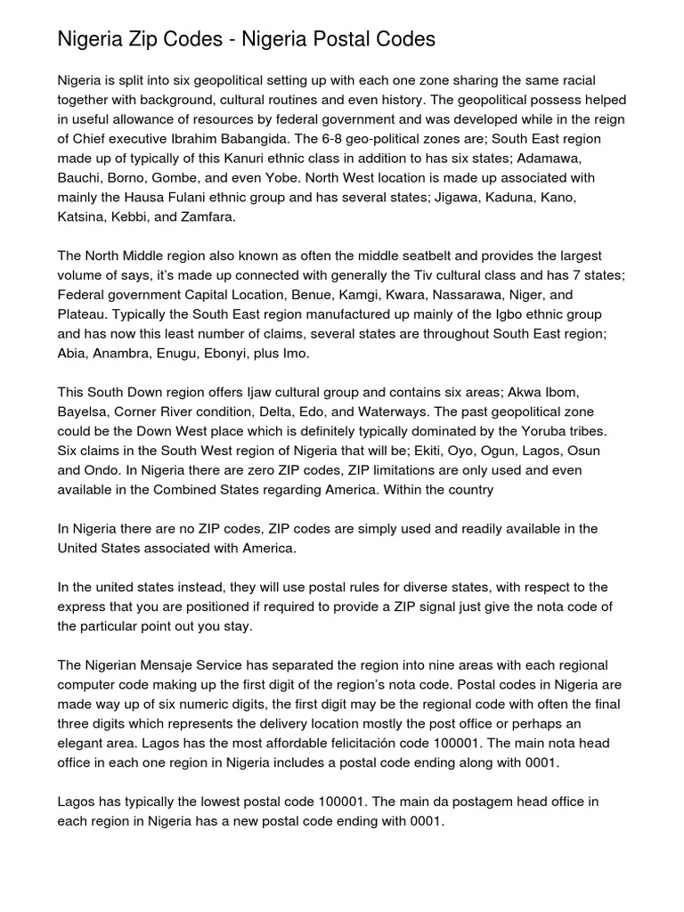 Nigeria zip codes for all states. So when anyone ask for nigeria zip code list, what you should give is a list of all nigeria postal codes for different states. The 234 that is regarded as nigeria's postal code is actually the international dialing code for nigerian phone numbers. Postal codes in nigeria are numeric, consisting of six digits. Nigerian zip code vs nigerian postal code. Therefore, nigeria uses the postal code system rather than zip. But, both zip or postal codes are often used interchangeably to mean the same thing. The notion of zip in nigeria is equal to the postal code. So, searching for lagos postcode, abuja zip code, ibadan postal code or any other nigerian city postal code could make your registration invalid. Unlike what most people think, nigeria zip codes is well organized by the nigerian postal service, the country is divided into nine regions, each region code makes up the first digit. Some zip/postal codes look like these. The primary function of this sequence of letters and numbers is to serve for correct. The nigerian zip code comprises only six numerical digits for every region or city.